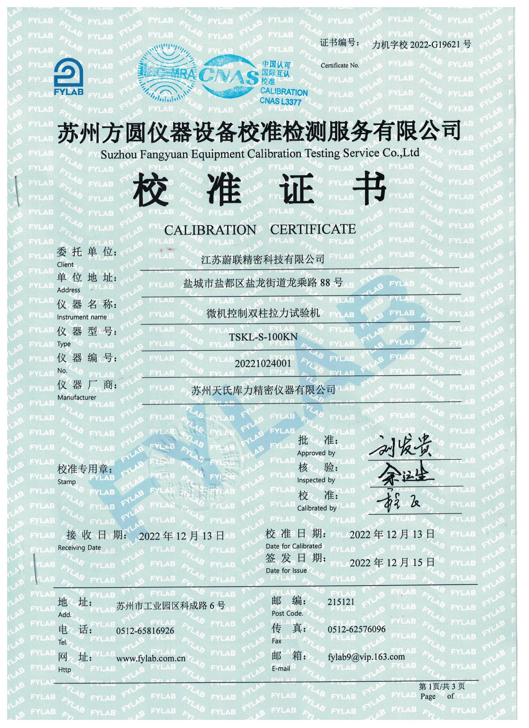 蘇州方圓儀器設備校準檢測服務有限公司校準證書