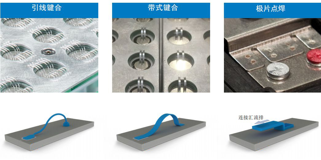 圖3 超聲引線鍵合、帶式鍵合和極片點(diǎn)焊。