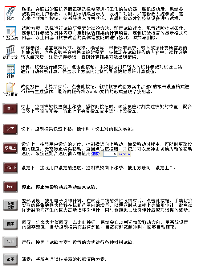 檢查限位開關(guān)位置是否正確設(shè)置-----打開設(shè)備電源---確認(rèn)設(shè)備電源指示燈已亮起---打開測(cè)控軟件----點(diǎn)擊聯(lián)機(jī)----確認(rèn)聯(lián)機(jī)成功----開始試驗(yàn)