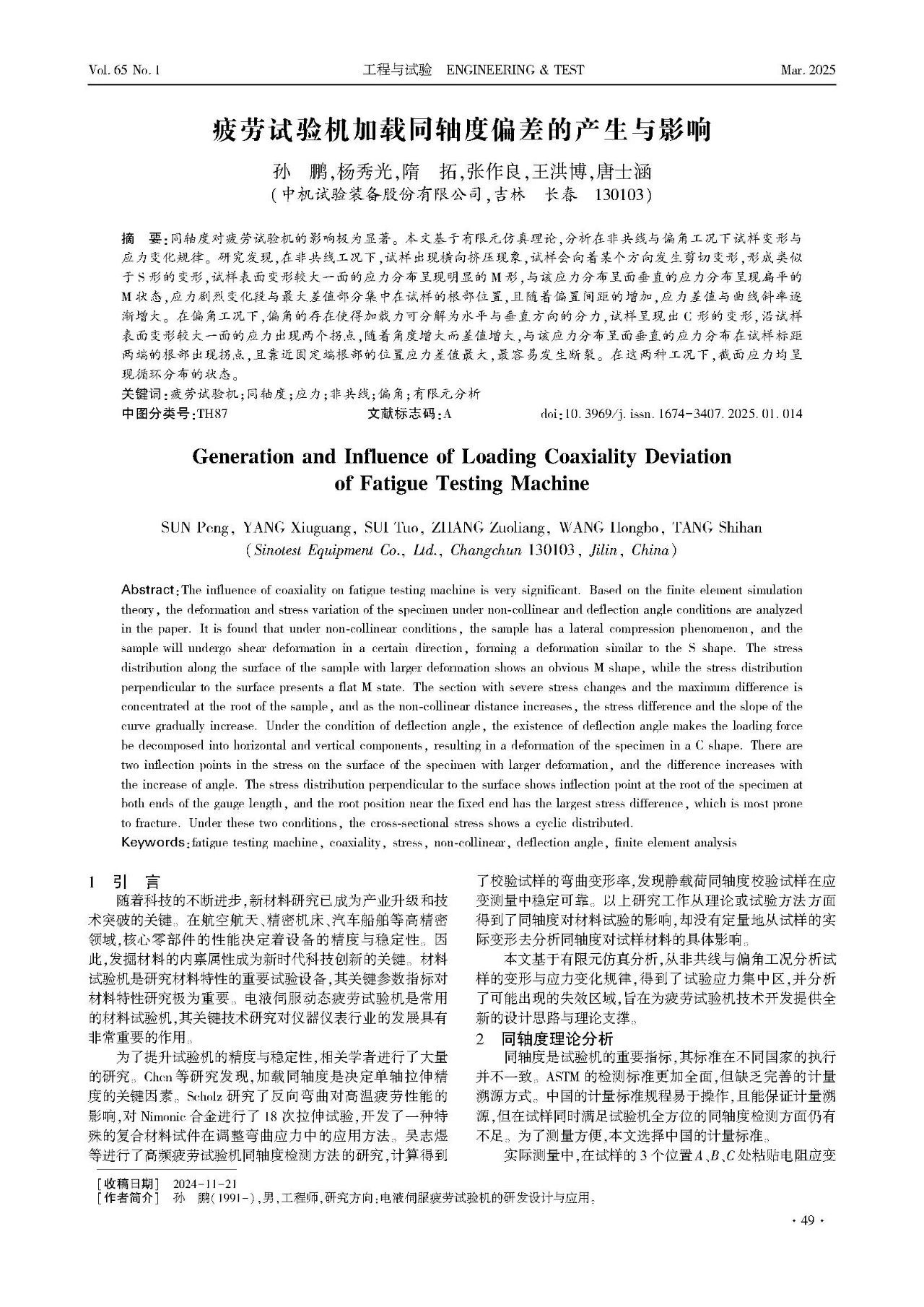 同軸度對疲勞試驗機的影響極為顯著。本文基于有限元仿真理論,分析在非共線與偏角工況下試樣變形與應力變化規律。研究發現,在非共線工況下,試樣出現橫向擠壓現象,試樣會向著某個方向發生剪切變形,形成類似于S形的變形,試樣表面變形較大一面的應力分布呈現明顯的M形,與該應力分布呈面垂直的應力分布呈現扁平的M狀態,應力劇烈變化段與最大差值部分集中在試樣的根部位置,且隨著偏置間距的增加,應力差值與曲線斜率逐漸增大。在偏角工況下,偏角的存在使得加載力可分解為水平與垂直方向的分力,試樣呈現出C形的變形,沿試樣表面變形較大一面的應力出現兩個拐點,隨著角度增大而差值增大,與該應力分布呈面垂直的應力分布在試樣標距兩端的根部出現拐點,且靠近固定端根部的位置應力差值最大,最容易發生斷裂。在這兩種工況下,截面應力均呈現循環分布的狀態。