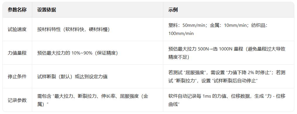 打開拉力機主機和配套軟件,選擇對應(yīng)的 “拉伸試驗方法”(如 “GB/T 1040.1-2006 塑料拉伸”),軟件會自動加載該方法的默認(rèn)參數(shù)(可后續(xù)調(diào)整)。
