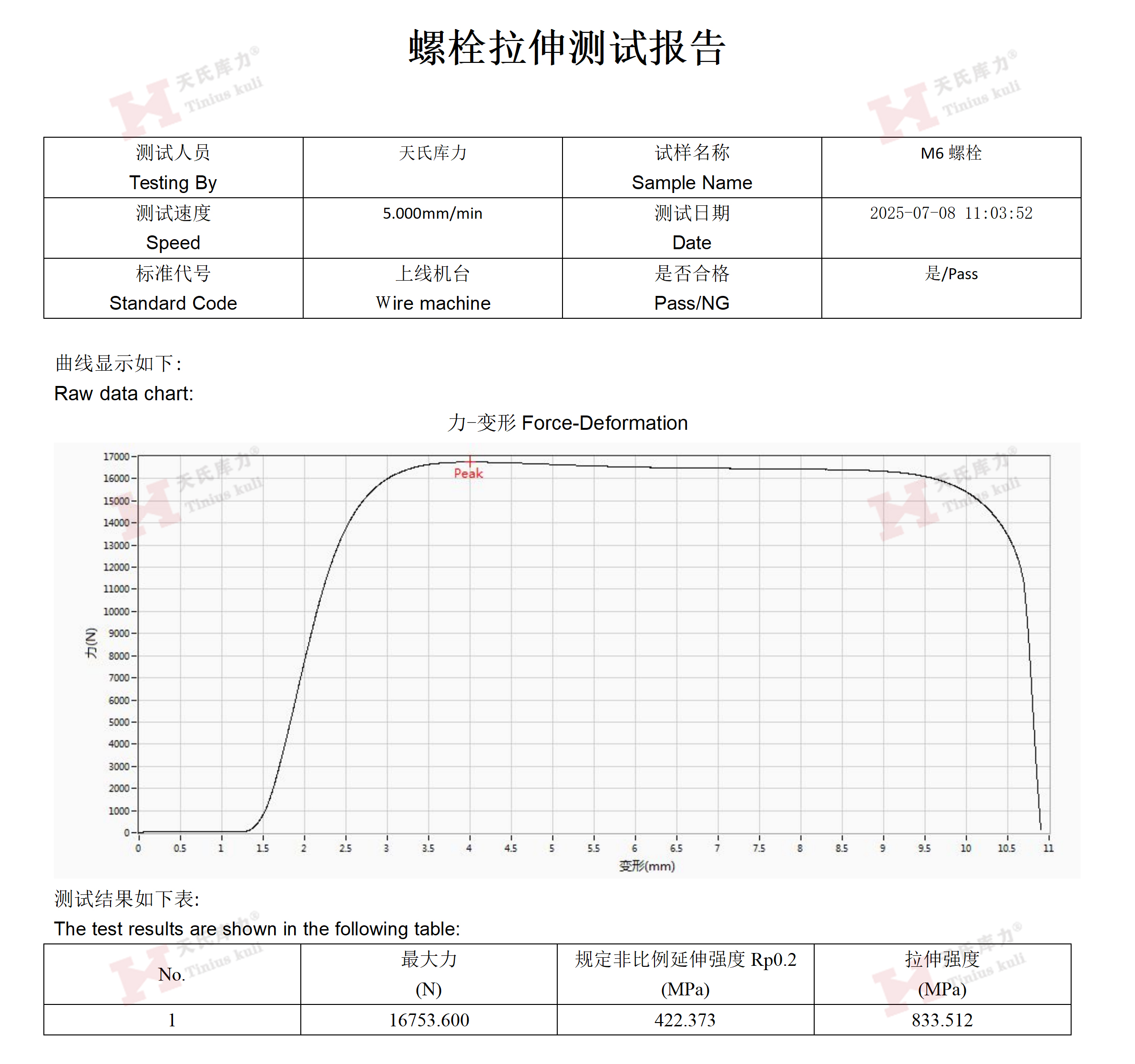 抗拉強(qiáng)度: 測量螺栓在斷裂前所能承受的最大應(yīng)力值。這是螺栓極限承載能力的體現(xiàn),為設(shè)計(jì)提供重要的安全余量依據(jù)。